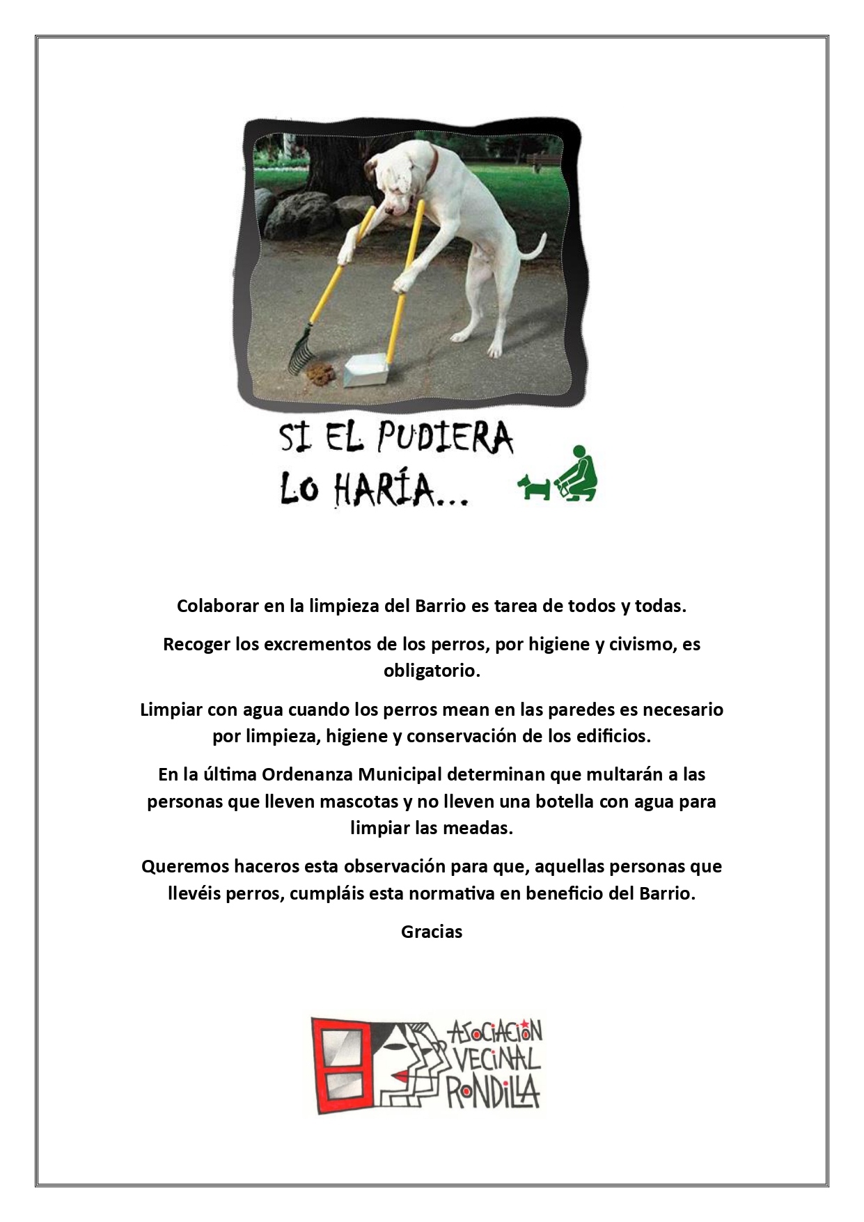 Queremos haceros esta observación para que, aquellas personas que llevéis perros, cumpláis esta normativa en beneficio del Barrio.