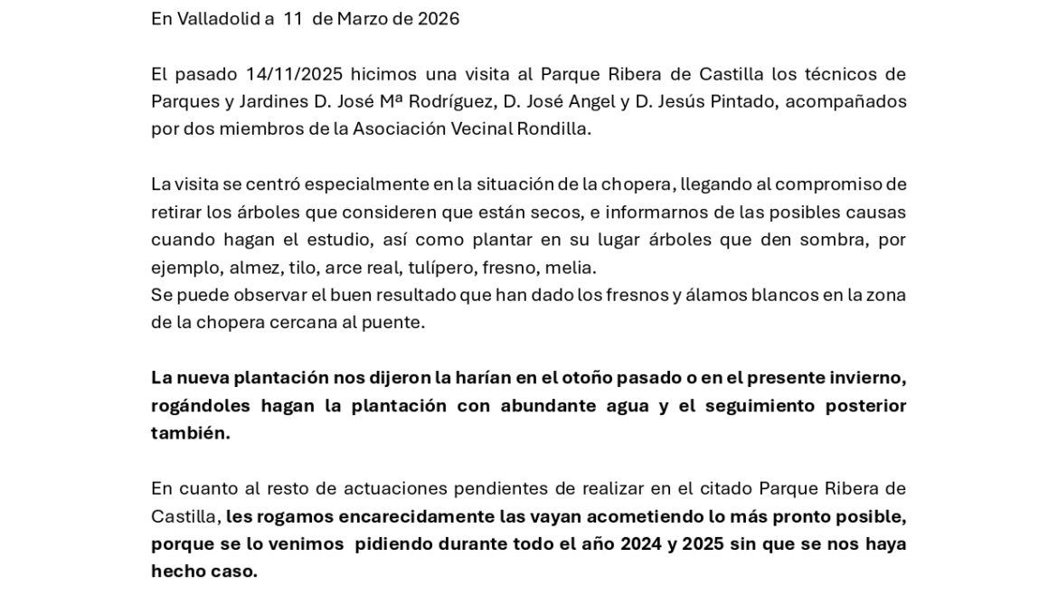 La Asociación Vecinal Rondilla cree que ha llegado el momento de reinvertir la tendencia. ¿Cómo?: Aplicando voluntad política. Por eso le pedimos hoy al Gobierno Municipal que se tomen en serio el mantenimiento del Parque Ribera de Castilla (que es uno de los pulmones y parajes más bonitos que tenemos en nuestra ciudad) para que los cientos o miles de ciudadanos lo sigamos disfrutando. Somos conscientes de lo difícil y costoso que es, pero no hay otra opción.