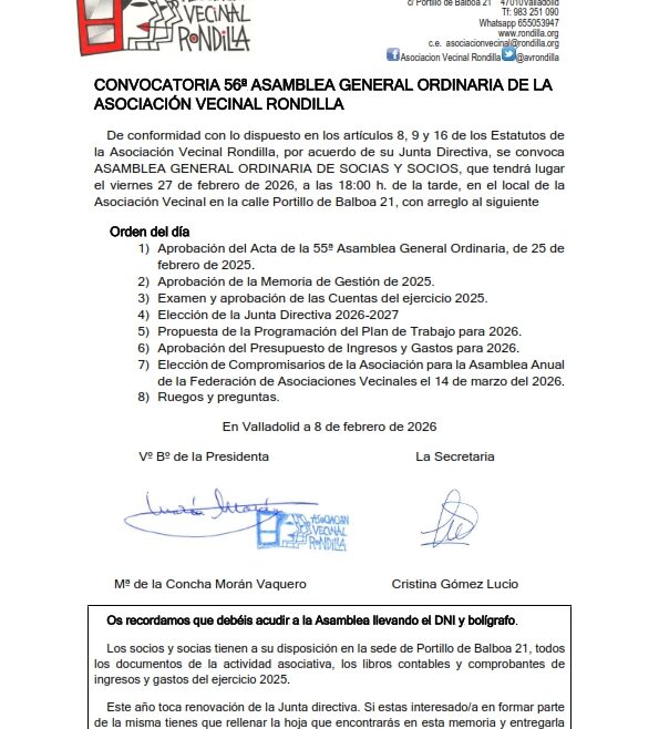 De conformidad con lo dispuesto en los artículos 8, 9 y 16 de los Estatutos de la Asociación Vecinal Rondilla, por acuerdo de su Junta Directiva, se convoca ASAMBLEA GENERAL ORDINARIA DE SOCIAS Y SOCIOS, que tendrá lugar el viernes 27 de febrero de 2026, a las 18:00 h. de la tarde, en el local de la Asociación Vecinal en la calle Portillo de Balboa 21, con arreglo al siguiente